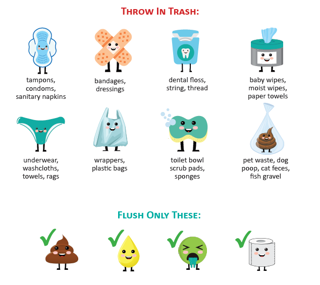 ✔ Avoid flushing wipes & sanitary items